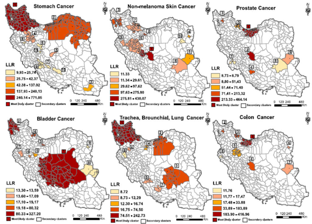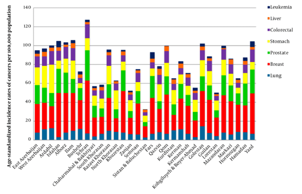 شکل زیر شش سرطان شایع در مردان در ایران را طی سالهای 1393 تا 1396 نشان میدهد: