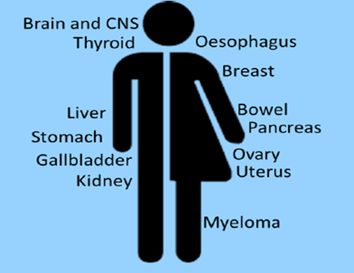 آژانس بین المللی تحقیقات سرطان (IARC) در گزارش 2020 شواهد قوی برای چاقی و خطر ابتلا به 13 سرطان مختلف یافت.